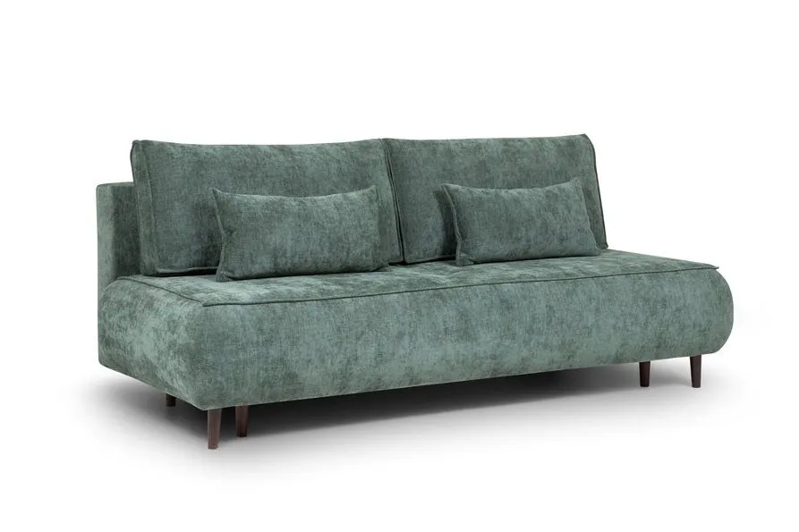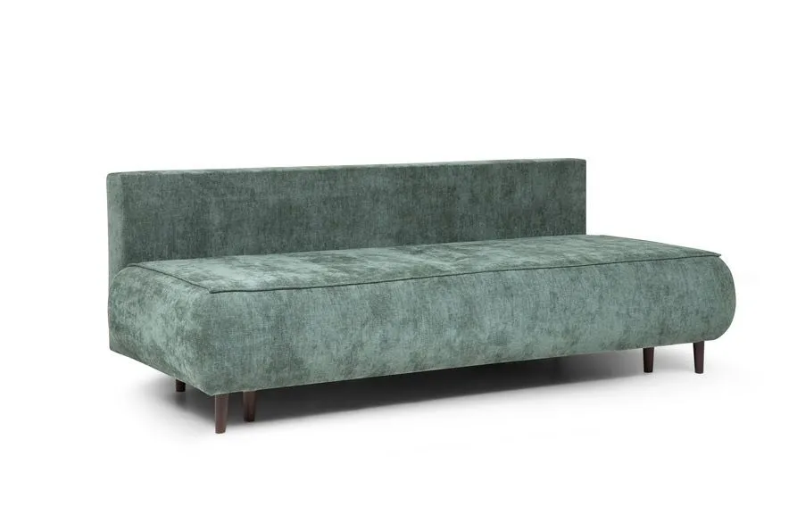 Прямой диван в приглушённом зелёном оттенке с мягкой бархатистой обивкой. Отличается лаконичным дизайном с плавными линиями и без подлокотников. Оснащён двумя декоративными подушками, гармонично вписанными в общий облик. Стоит на невысоких деревянных ножках. Сочетает в себе комфорт и современный стиль - отлично подойдёт для гостиной или зоны отдыха.